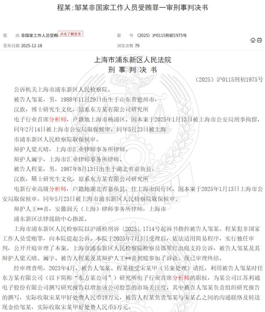 指向东方财富证券原电子首席刑事判决书显示,被告人邹某,男,1988年出生,博士研究生文化,原系东方某有限公司研究所电子行业首席分析师,因本案于2025年1月13日被拘留;被告人程某,男,1987年出生,汉族,硕士研究生文化,原系东方某有限公司研究所电新行业高级分析师。不过,并未披露相关人员姓名。