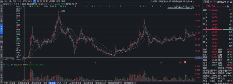 截至2025年12月24日收盘,利通电子最新股价报26.87元/股,年内涨幅达35.84%,总市值达70.50亿元。截至25日上午11时,该公司股价微跌1%。