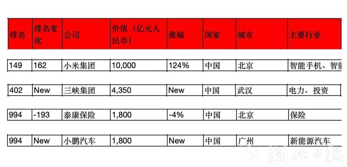 湖北日报全媒记者梳理发现,还有多家由湖北籍企业家创办及担任董事长、CEO的企业入列榜单。雷军创办的小米集团以1万亿元的价值位列榜单第149位,排名较上届大幅提升162位;陈东升创办的泰康保险、何小鹏创办的小鹏汽车均以1800亿元的价值位列榜单第994位,其中小鹏汽车为今年新上榜企业。