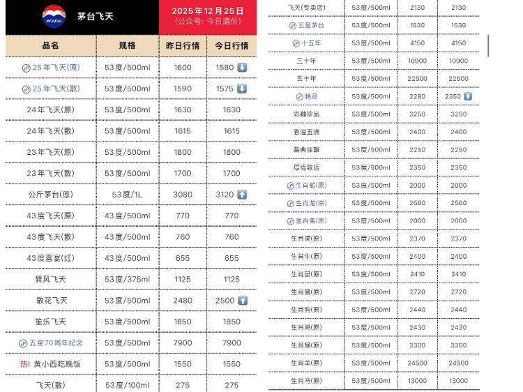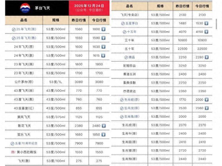 2025年12月24日,“今日酒价”批发价格报价数据显示,茅台飞天系列多款核心产品市场价格出现上调,其中,25年飞天原箱、散瓶,24年飞天原箱、散瓶等基础款产品价格均有不同程度上涨,散花飞天、笙乐飞天等特色款涨幅尤为显著,引发市场广泛关注。而25日,茅台各品类白酒稳中有变,多数品类价格保持稳定,部分品类出现涨跌。