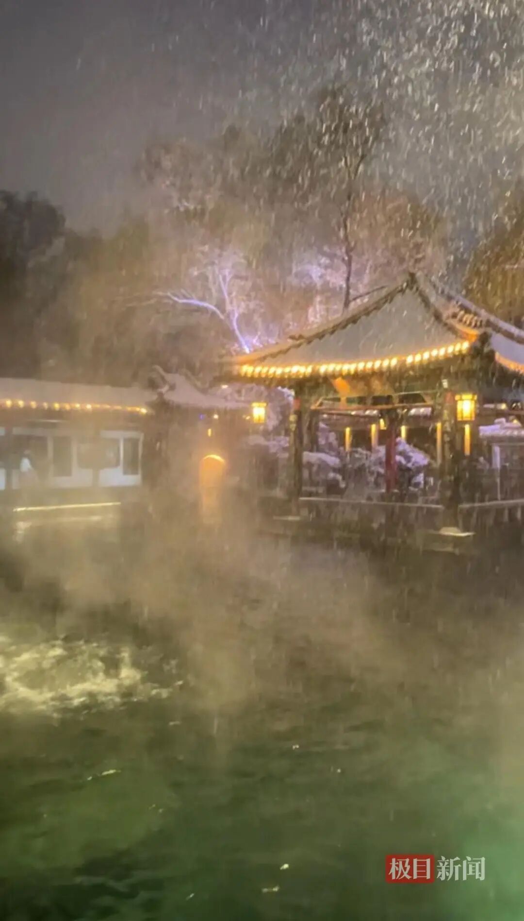 12日晚,天空飘着鹅毛大雪,趵突泉泉池围栏上,积雪已达数厘米厚。趵突泉泉池内,三股泉水汩汩喷涌,泉池之上薄雾缭绕。在灯光的映照下,雾气与雪花交织成一片朦胧,将夜色渲染得格外迷人。